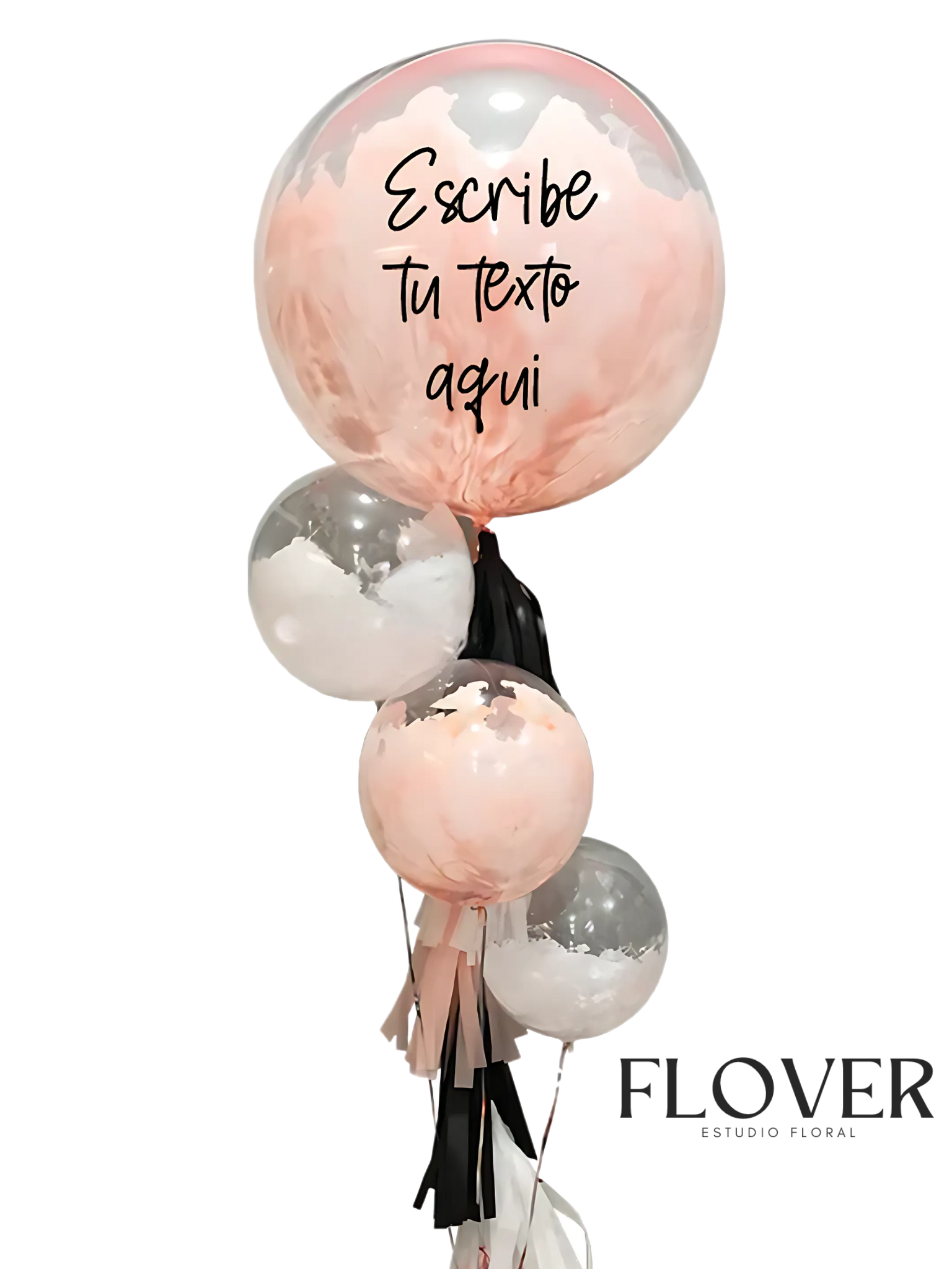 Globo burbuja de 36 pulgadas decorado con pintura melón y blanca inflado con helio, 8 guirnaldas en color melón, negro y blanco, 2 globos látex de 12 pulgadas con pintura blanca, 1 globo látex de 12 pulgadas decorado con pintura melón y blanca y un contrapeso.