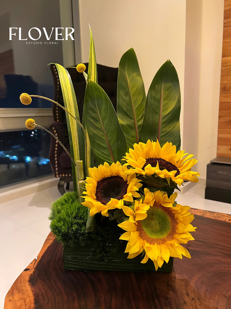 Este arreglo moderno y vibrante presenta tres girasoles brillantes complementados por follaje exótico y craspedias amarillas, creando una composición alegre y llena de vida. La base de follaje verde y la disposición en un contenedor bajo le dan un toque minimalista y elegante, ideal para espacios contemporáneos o como un regalo que transmita energía positiva.