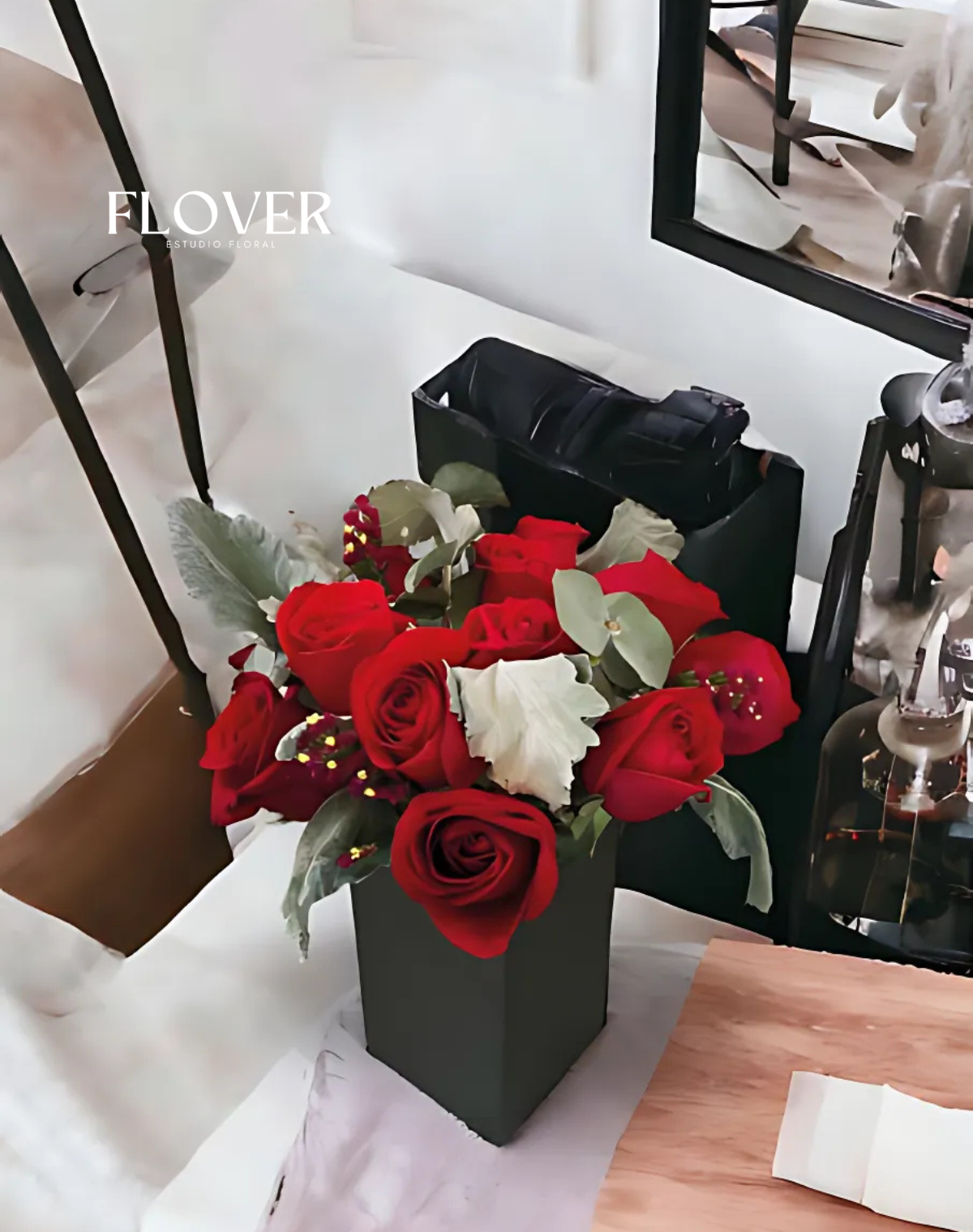 Perfecto para ocasiones que celebran el amor, la pasión o momentos inolvidables, este diseño captura la esencia de la elegancia atemporal. La caja negra añade un toque contemporáneo y minimalista, convirtiendo este arreglo en el complemento ideal para cualquier ambiente moderno.
