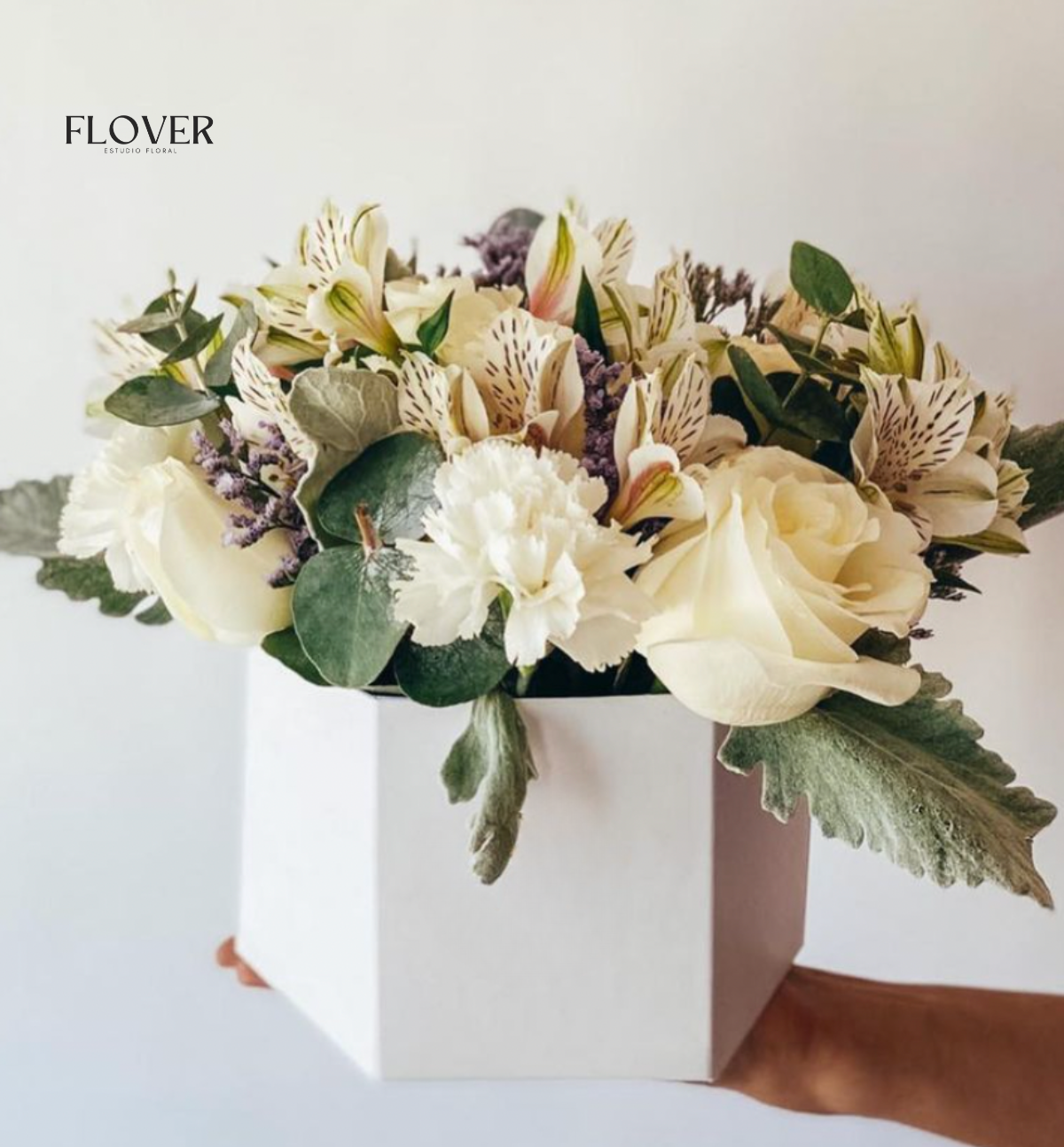 Este delicado arreglo floral en caja es una expresión de pureza y elegancia natural. Las rosas blancas se destacan por su belleza clásica, mientras que las alstroemerias en tonos suaves con sus finas líneas aportan un toque exótico y distintivo al diseño.