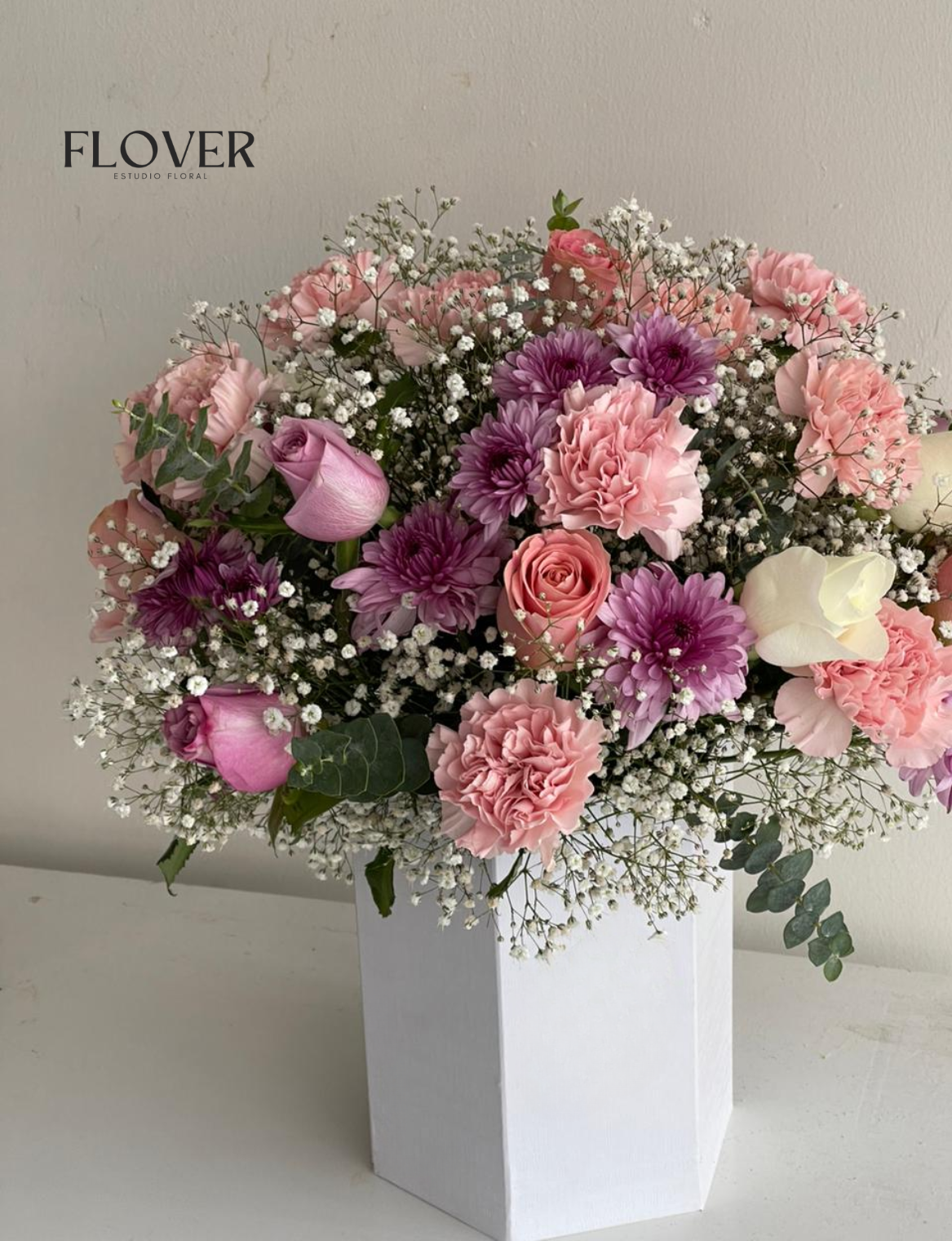El romanticismo se encuentra en cada pétalo de este hermoso arreglo floral. Un mix exquisito de rosas en suaves tonos pastel, claveles y morelianas que juntos crean un juego de colores delicados. El fondo aéreo de la baby breath añade una atmósfera de ensueño, mientras que el follaje de dólar da el toque natural necesario para equilibrar la composición. Perfecto para llenar cualquier espacio de calidez y sofisticación.
