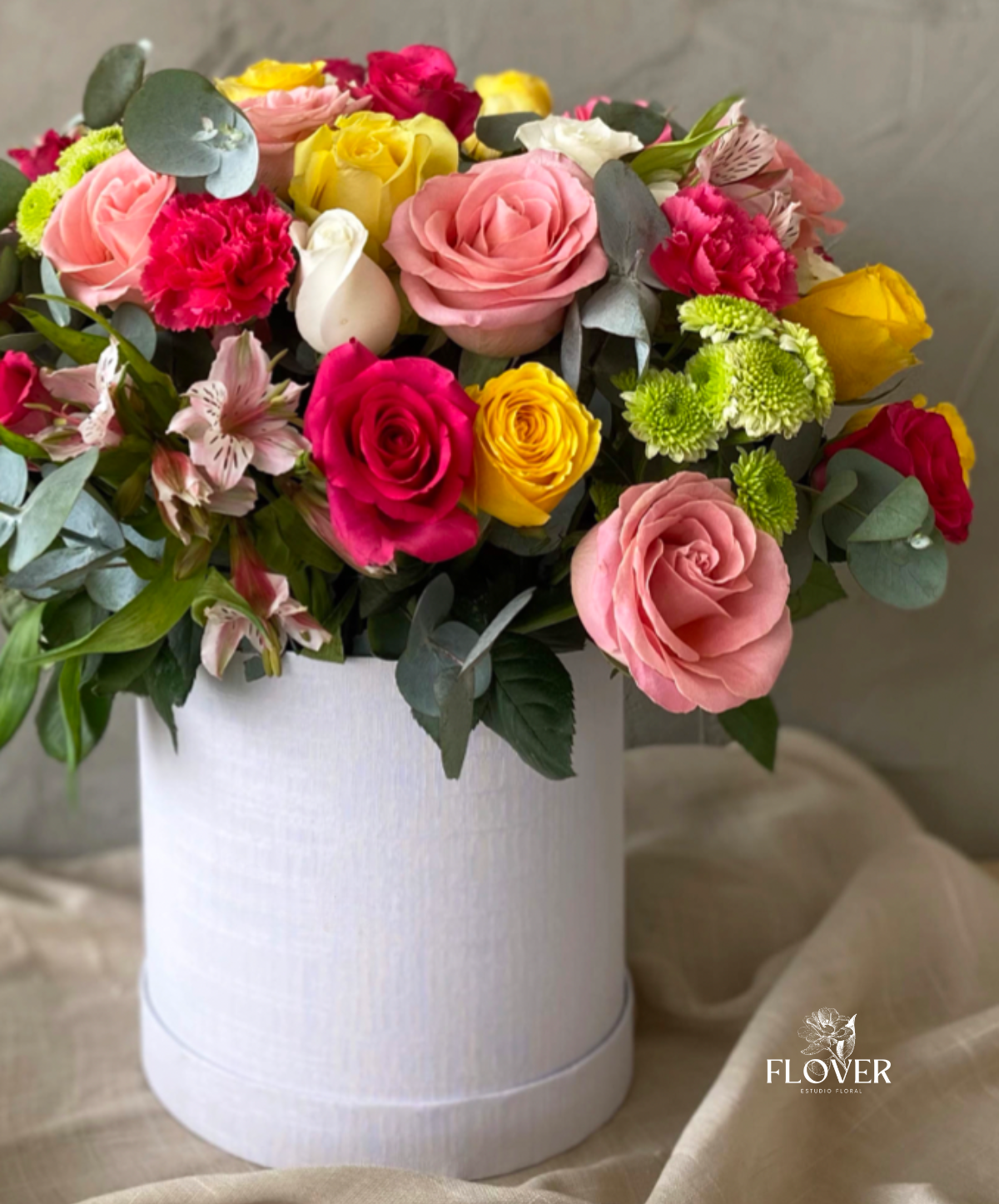 Este vibrante arreglo floral en caja redonda es una explosión de color y frescura, compuesto por una exquisita selección de rosas y claveles en tonos rosados, fucsias, amarillos y blancos. Los contrastes entre las flores, junto con los delicados detalles de alstroemerias y follaje verde , crean una composición equilibrada que evoca alegría y elegancia.