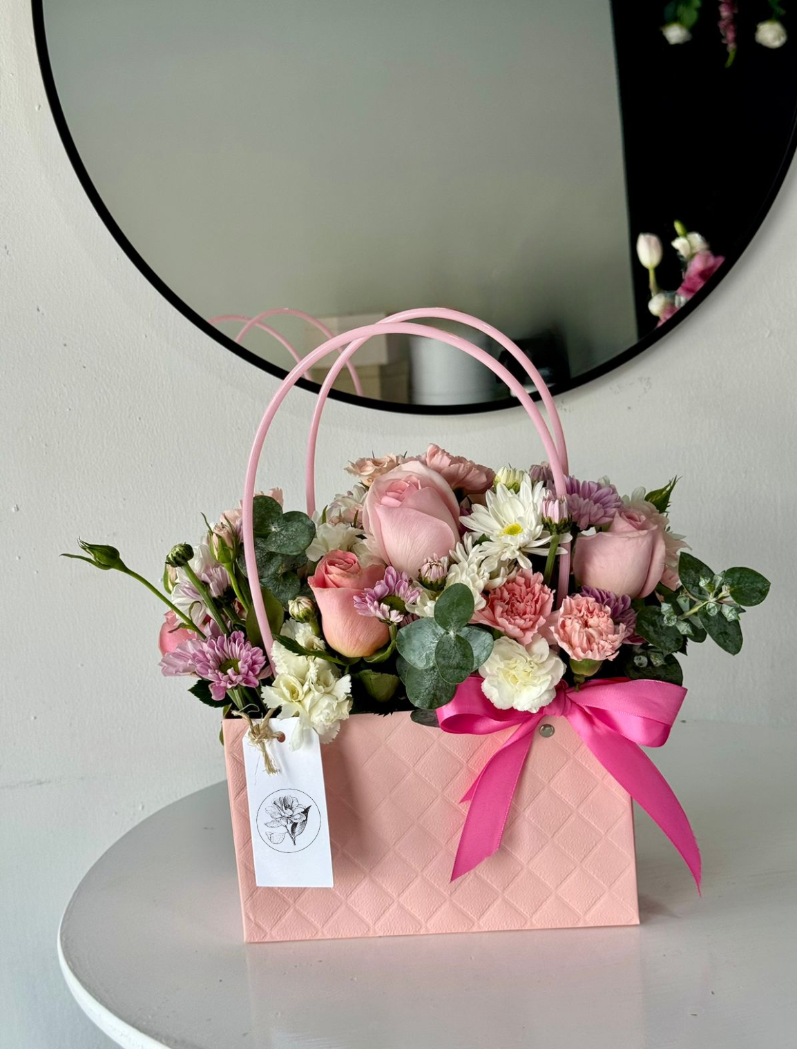 Este adorable y delicado arreglo floral en forma de bolsa es perfecto para cualquier ocasión especial. Compuesto por una mezcla de rosas rosadas , claveles y crisantemos en tonos suaves, este diseño floral irradia ternura y elegancia. El follaje verde complementa espectacularmente las flores, aportando frescura y volumen al arreglo.