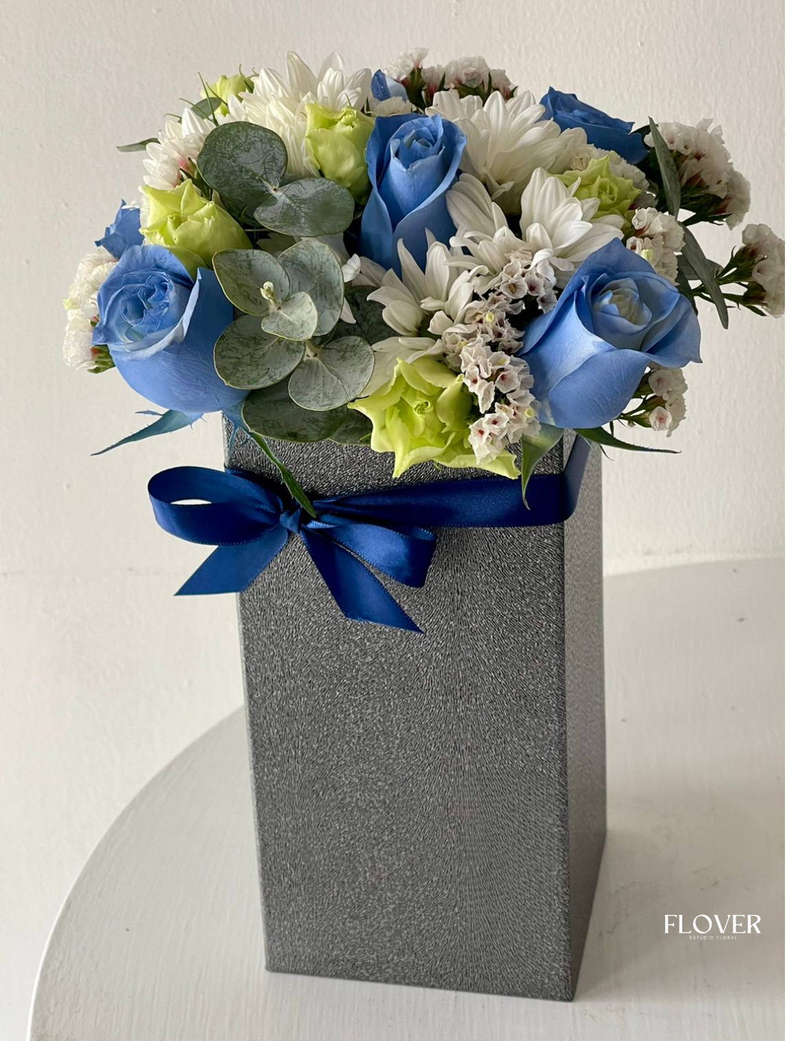 Este elegante arreglo floral presenta un vibrante contraste de colores, protagonizado por las exclusivas rosas azules que aportan un toque moderno y confortable. Acompañadas de crisantemos blancos , pequeños claveles verdes y delicado eucalipto , este arreglo es perfecto para expresar sentimientos de aprecio y admiración.