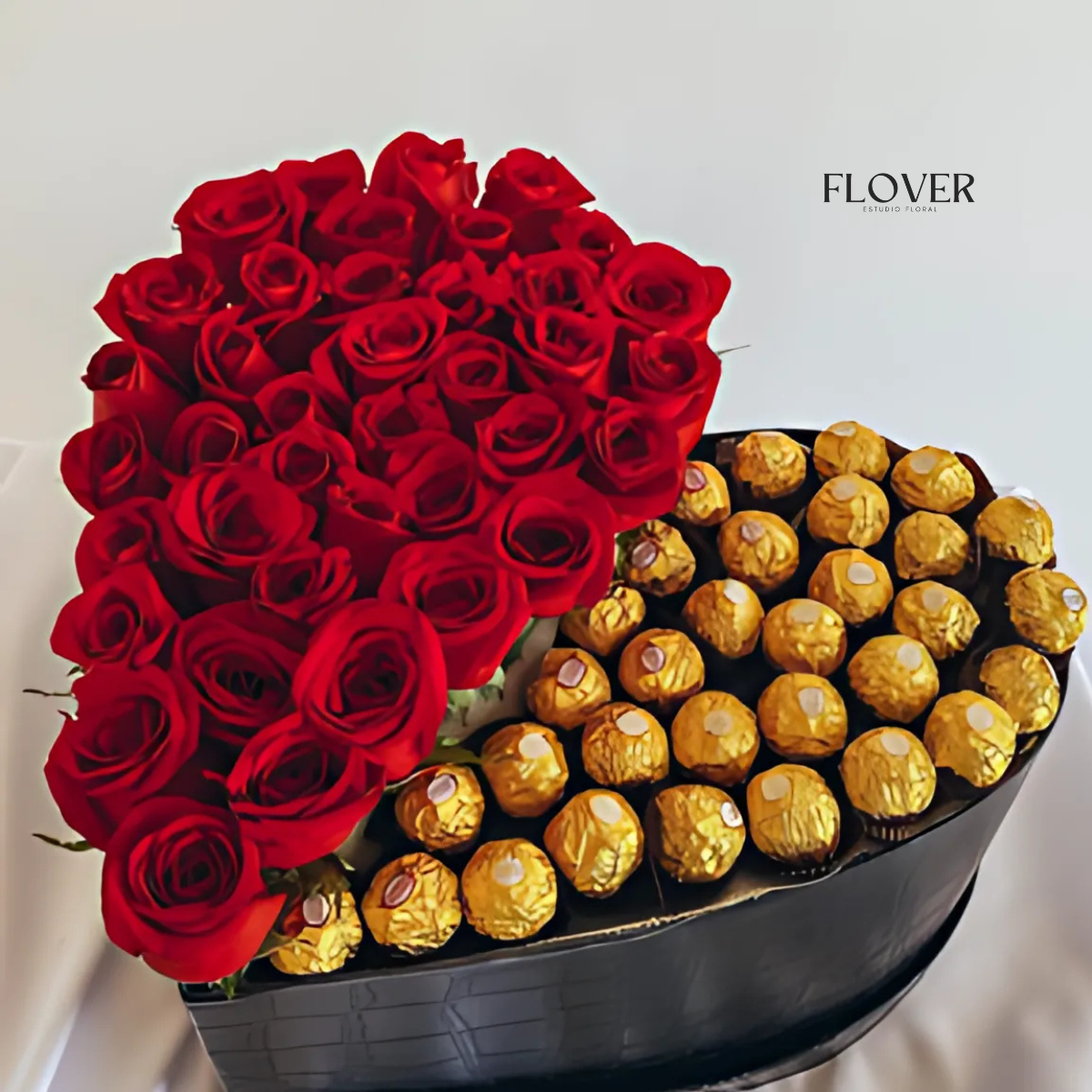 Este lujoso y romántico arreglo combina el glamour de las rosas rojas con la indulgencia de los chocolates Ferrero Rocher . Presentado en una elegante caja en forma de corazón , la mitad está llena de vibrantes y frescas rosas rojas, símbolo del amor y la pasión, mientras que la otra mitad ofrece exquisitos chocolates dorados que aportan un toque de dulzura y elegancia.