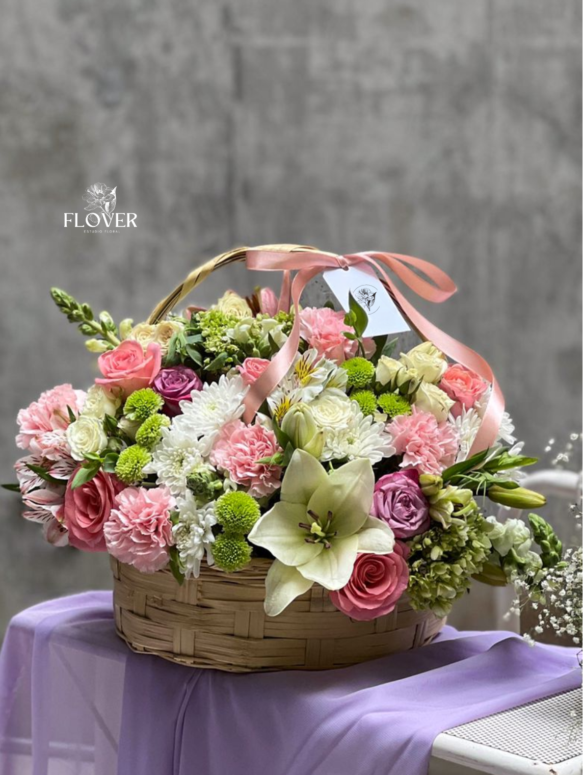 Este espectacular arreglo floral en canasta está compuesto por una cuidadosa selección de rosas en tonos suaves, elegantes lilies, y delicados claveles, acompañados de vibrantes crisantemos y frescas alstroemerias. Cada flor ha sido elegida por su belleza y frescura, creando una combinación perfecta que destaca por su armonía de colores y texturas.