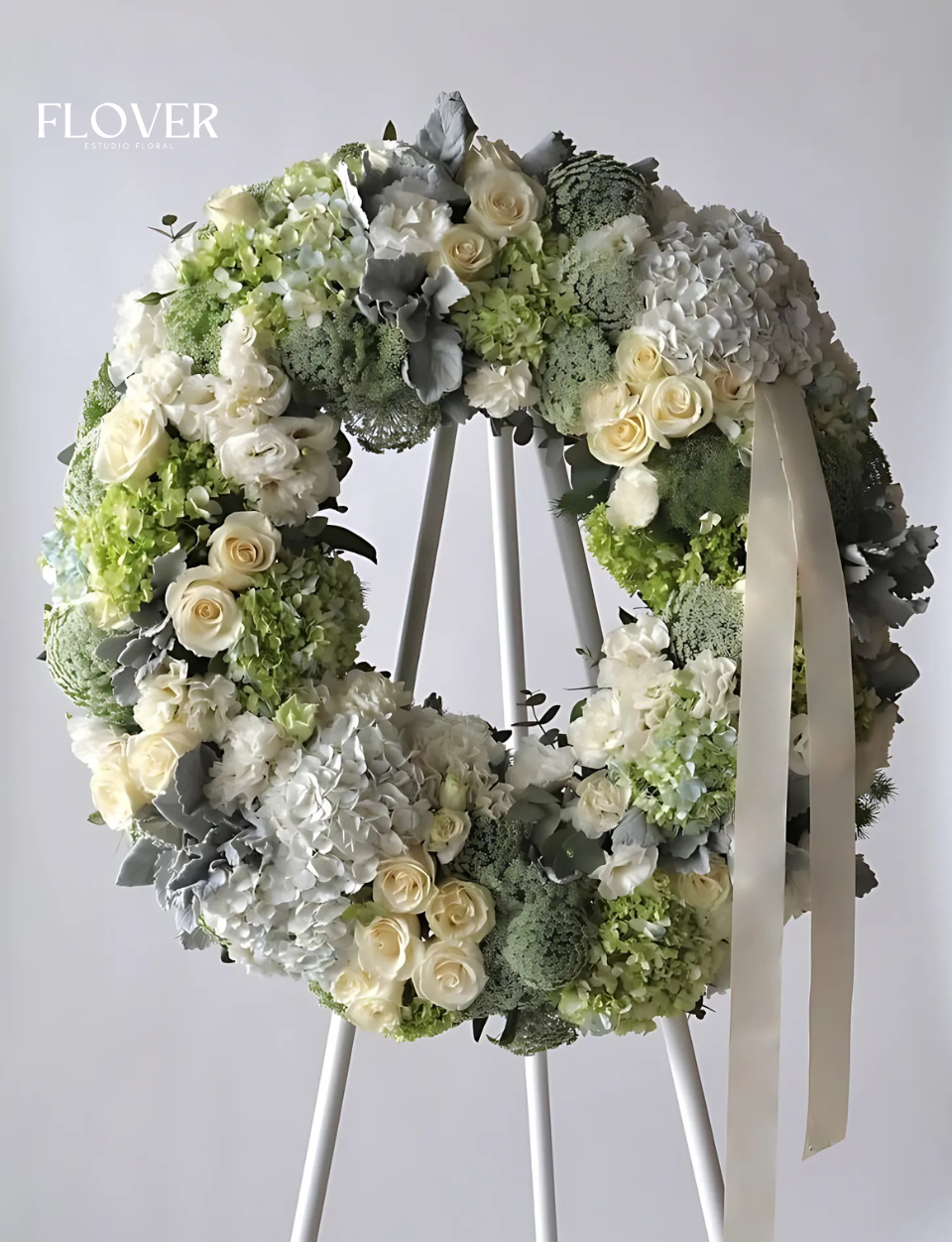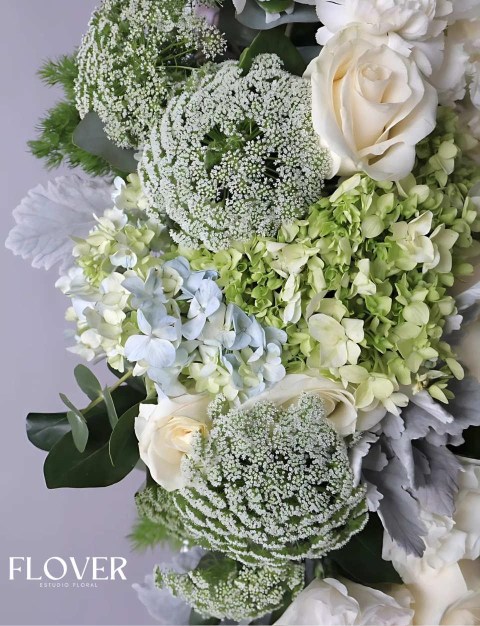 Flores principales : Hortensias, lisianthus, claveles, rosas, minfer y encaje, acompañadas de un toque distintivo de Flover que aporta suavidad y elegancia al diseño.