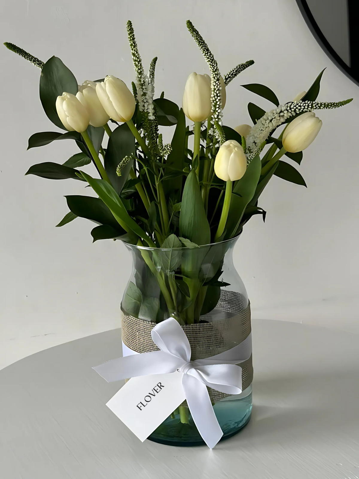 Este arreglo floral combina con elegancia tulipanes blancos, verónica Smart Luna, y ruscus, creando un diseño fresco, sofisticado y moderno.