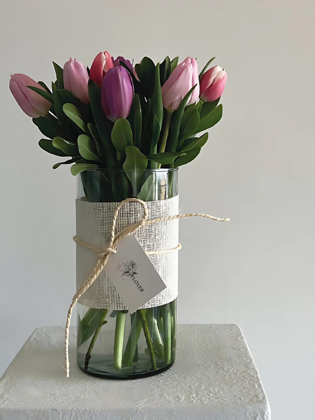 Este arreglo floral está compuesto por 10 tulipanes en tonos variados de rosa, morado y púrpura, creando una presentación elegante y minimalista. Los tulipanes, con su forma distintiva y estilizada, están acompañados por un follaje verde que complementa perfectamente los colores suaves de las flores. El jarrón de cristal transparente añade un toque moderno y limpio al conjunto.