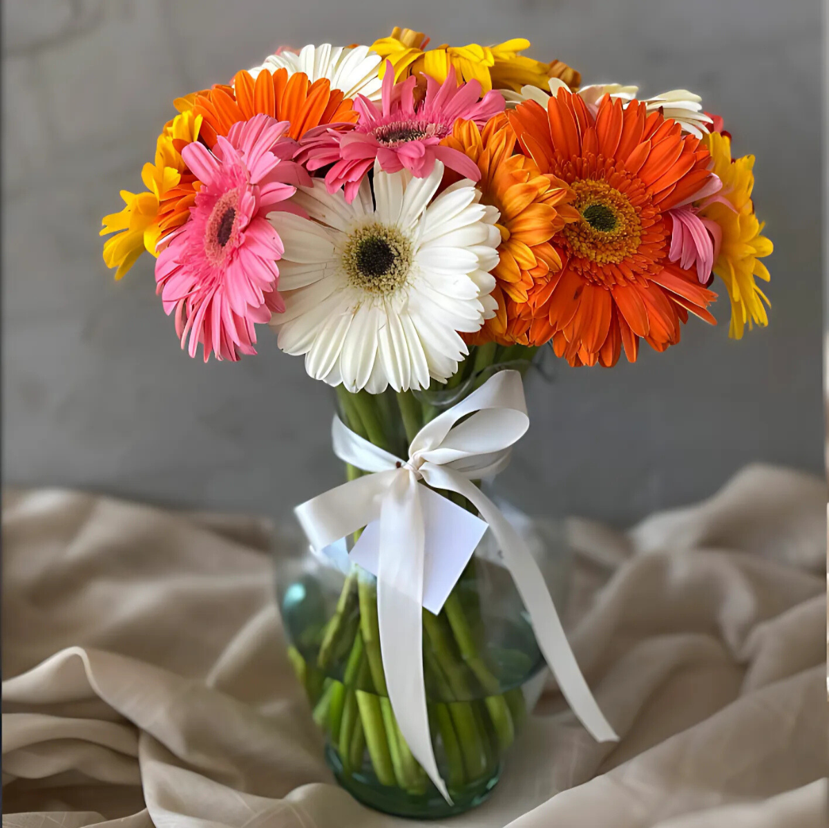 Este arreglo floral en jarrón está compuesto por 30 gerberas en tonos variados, creando una explosión de color vibrante y alegre. Las gerberas, conocidas por sus grandes pétalos y colores brillantes, están distribuidas de manera uniforme en el ramo, destacándose en tonos como blanco, rosa, naranja y amarillo.