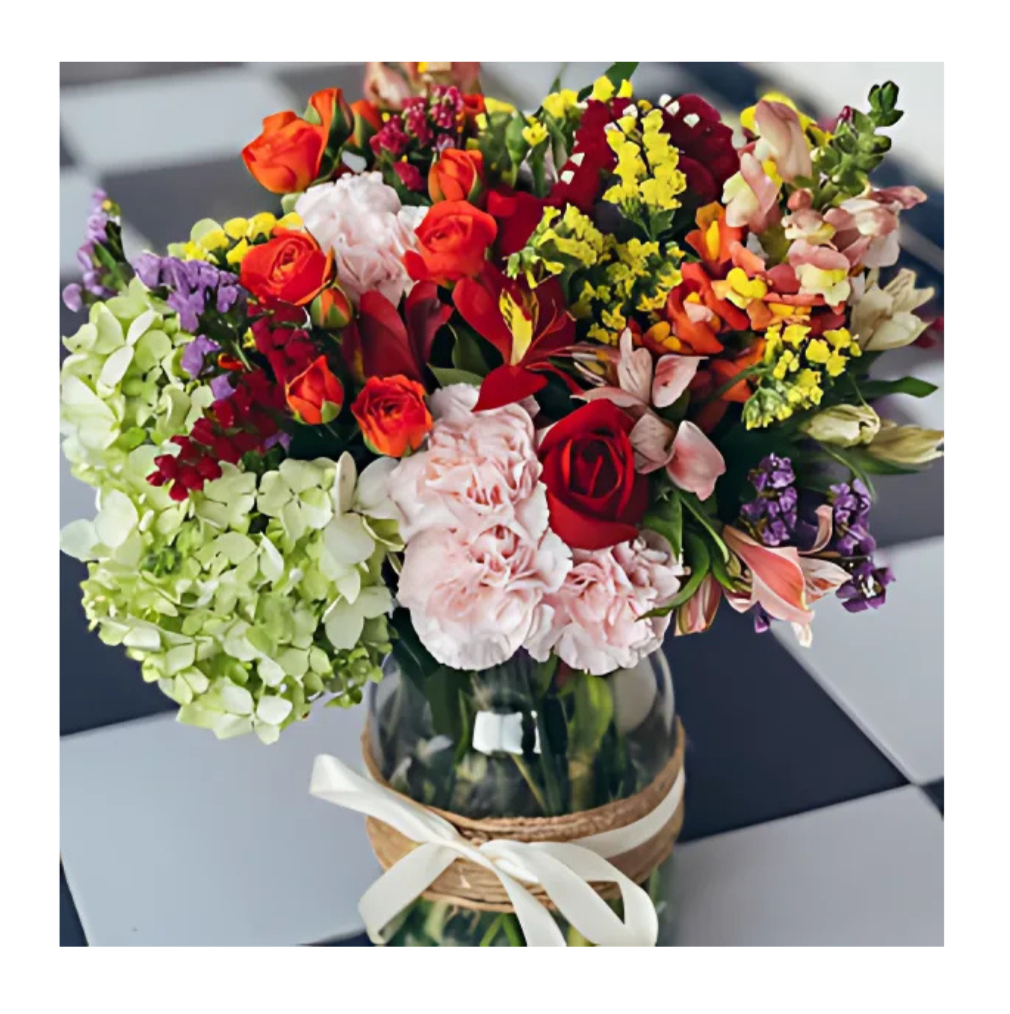 Este tipo de composición es ideal para celebraciones especiales, ofreciendo una mezcla de colores vivos y texturas elegantes que juntos crean un arreglo lleno de vida y alegría.