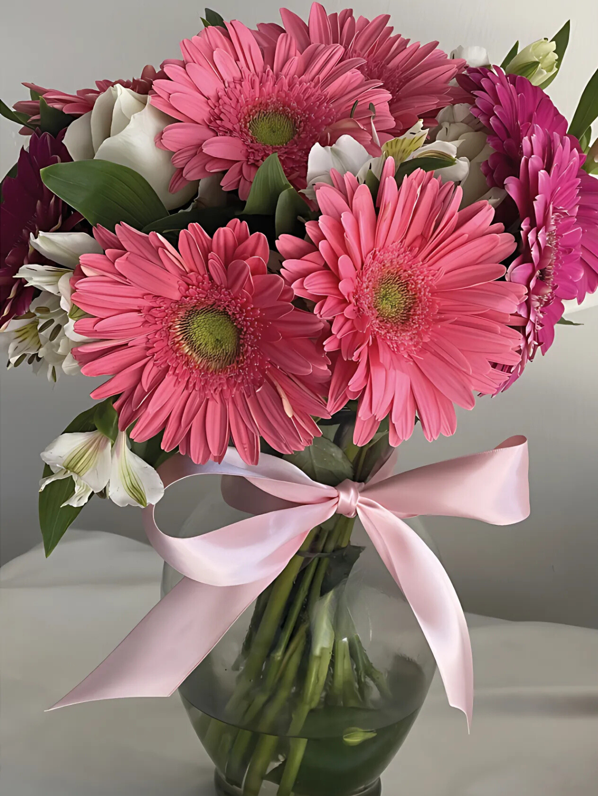 Este hermoso arreglo floral combina gerberas rosadas, rosas blancas y astromelias, creando un contraste delicado y armonioso entre los tonos vibrantes y los suaves. Las gerberas rosadas dominan la parte visual del arreglo con sus grandes y llamativos pétalos, añadiendo un toque alegre y enérgico. Las rosas blancas aportan un aire de elegancia y pureza, equilibrando la intensidad de las gerberas y ofreciendo un contraste sutil pero sofisticado.