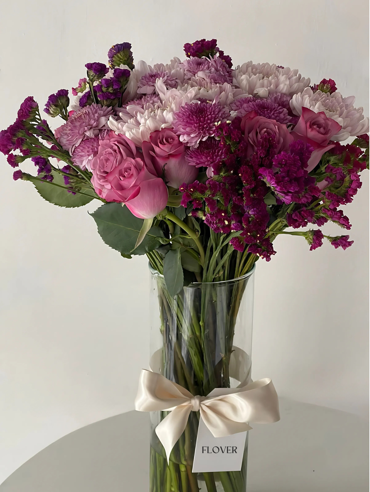 Este elegante arreglo floral combina rosas rosadas, flores Roxana, morelianas y static (limonium), creando una paleta de colores en tonos púrpura, lila y rosado. Las rosas aportan romanticismo y suavidad, mientras que las flores Roxana y moreliana añaden textura y volumen con sus pétalos redondeados y en capas. El static, con sus pequeñas flores púrpuras, complementa el conjunto con una textura ligera y aérea.