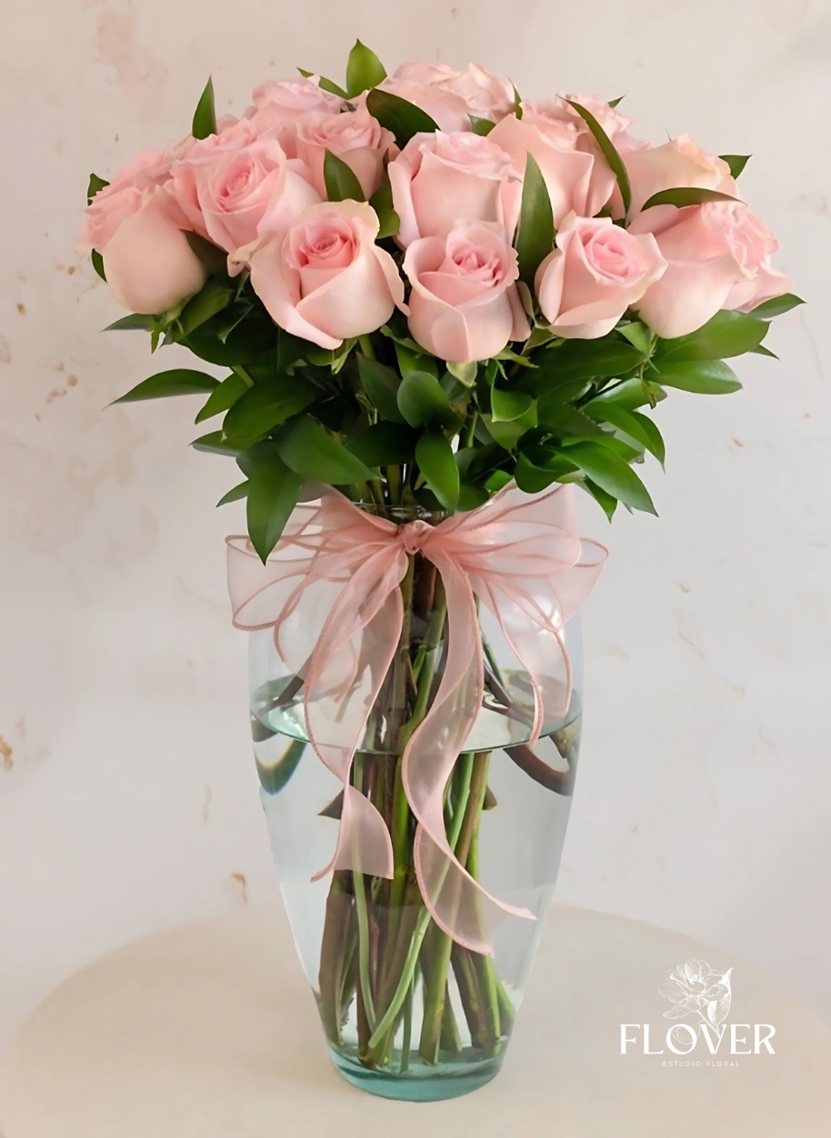 Este elegante arreglo de rosas rosadas en un jarrón de vidrio es perfecto para transmitir ternura y sofisticación. Las rosas, en su delicado tono pastel, están acompañadas de un follaje verde que realza su color suave y aporta frescura. Un lazo de cinta rosada alrededor del jarrón añade el toque final, haciendo de este arreglo una opción ideal para expresar amor, gratitud o felicitaciones de una manera clásica y refinada.
