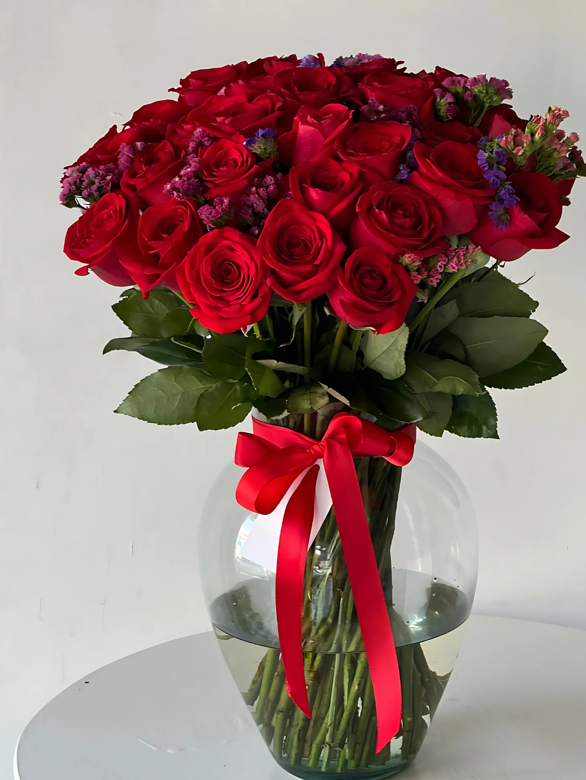 Este arreglo floral presenta 40 rosas rojas acompañadas de static (limonium) en un elegante jarrón de cristal. Las rosas, de un vibrante tono rojo, están dispuestas en un estilo voluminoso y clásico, con el limonium aportando pequeños detalles en tonos lila que complementan las rosas sin restarles protagonismo.