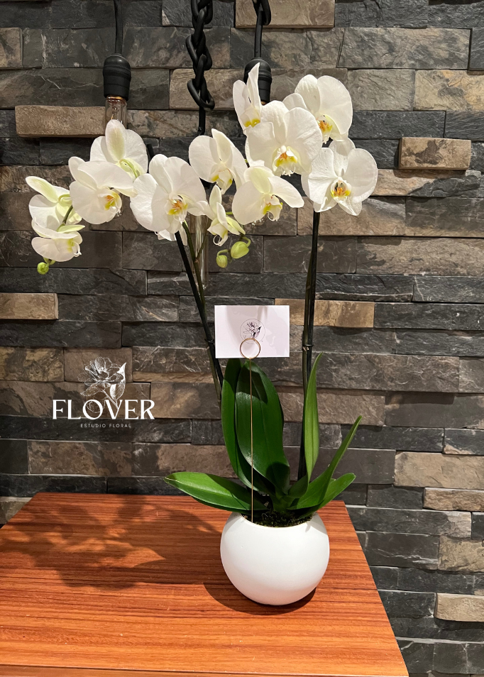 Descubre la pureza y sofisticación de nuestras orquídeas blancas, presentadas en una delicada base esférica de cerámica que complementa perfectamente su belleza natural. Este arreglo es ideal para transformar cualquier espacio con un toque de frescura y distinción.