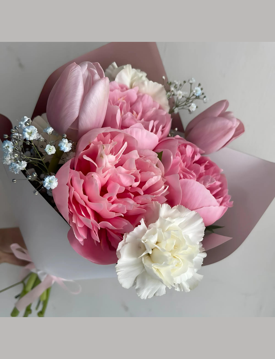Este encantador ramo está compuesto por 3 peonías y 2 tulipanes, creando una combinación visualmente impactante y llena de significado. Las peonías, con sus grandes y exuberantes flores, son conocidas por su fragancia dulce y su simbolismo de riqueza, prosperidad y romance. Su textura suave y su variedad de colores, desde los tonos suaves de rosa hasta el blanco puro, añaden un toque de elegancia y feminidad al ramo.