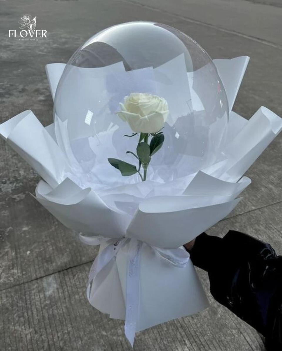 Este sofisticado y minimalista arreglo presenta una sola rosa blanca encapsulada en una esfera transparente, que le da un aspecto elegante y moderno. La rosa flota visualmente dentro de su burbuja, destacando su pureza y belleza natural. Envuelto en un delicado papel blanco y decorado con un lazo, este diseño es perfecto para quienes buscan un detalle exclusivo y refinado. Ideal para expresar amor eterno, paz o buenos deseos de una manera única y memorable.