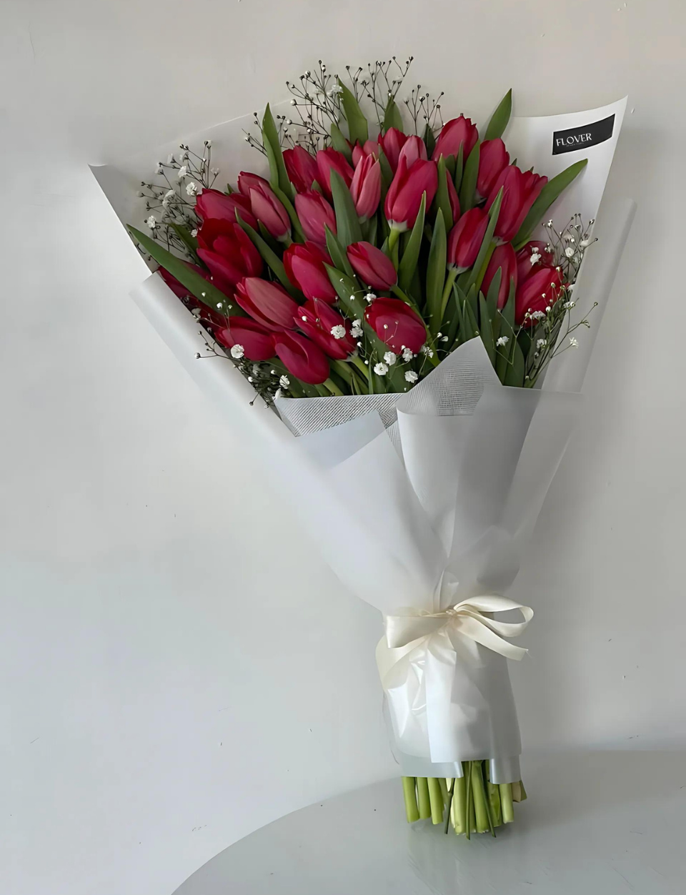 La adición de las flores de baby breath, con su apariencia ligera y etérea, crea un contraste suave y sutil, aportando volumen y una sensación de delicadeza que realza la belleza de los tulipanes. El efecto visual es armonioso y equilibrado, ideal para momentos especiales como aniversarios, celebraciones importantes o como un regalo que ilumina el día de alguien querido.