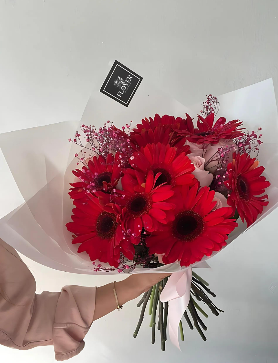 Este ramo compuesto por 10 rosas, 10 gerberas y flores de baby breath (gypsophila) es una encantadora mezcla de elegancia y frescura, adaptable a cualquier ocasión. Las rosas, con su belleza clásica, simbolizan amor y aprecio, mientras que las gerberas, conocidas por su vibrante y alegre forma, aportan una chispa de vitalidad y optimismo.