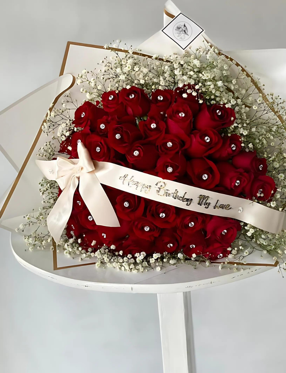Este majestuoso ramo de 50 rosas rojas decoradas con diamantitos y acompañadas de delicadas flores de baby breath (gypsophila) es un símbolo inigualable de elegancia y sofisticación. Las rosas rojas, que tradicionalmente representan el amor profundo y la pasión, están embellecidas con pequeños diamantitos que añaden un toque de lujo y brillo, elevando el arreglo a una obra de arte floral.