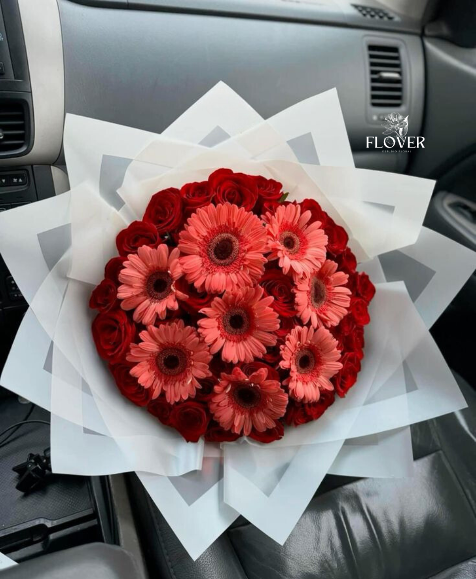 Este arreglo combina la elegancia de las rosas rojas, símbolo de amor y pasión, con la frescura de las gerberas coral, que añaden alegría y optimismo. Juntas, crean un bouquet sofisticado y lleno de vida, ideal para expresar sentimientos profundos y celebrar momentos especiales.