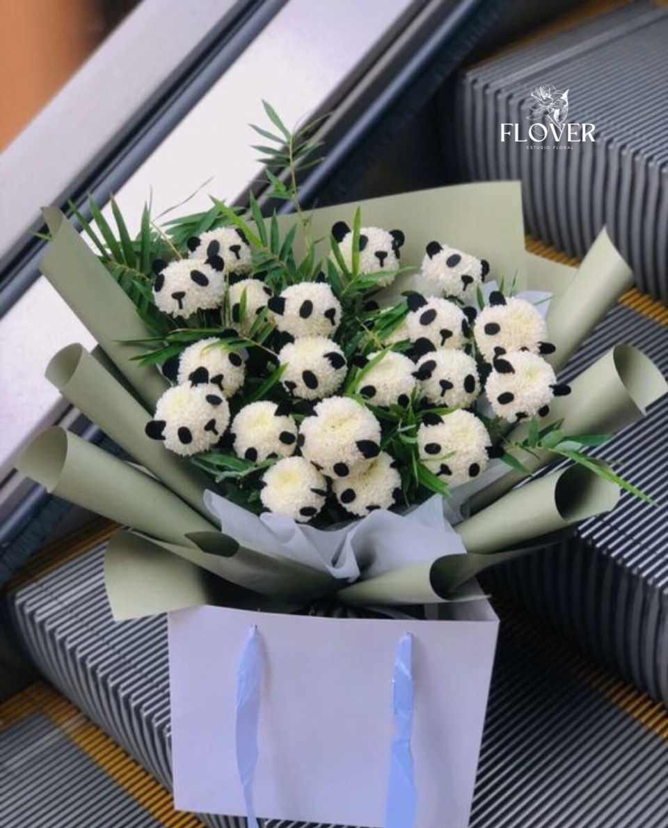 Este adorable arreglo floral está diseñado para sorprender y encantar. Cada flor ha sido cuidadosamente decorada para parecer un tierno panda, creando un bouquet único y lleno de creatividad. Acompañado de hojas verdes que imitan el hábitat natural de los pandas, este arreglo es perfecto para quienes buscan un detalle divertido y original. Ideal para ocasiones especiales o como regalo inesperado para amantes de los pandas y la naturaleza.
