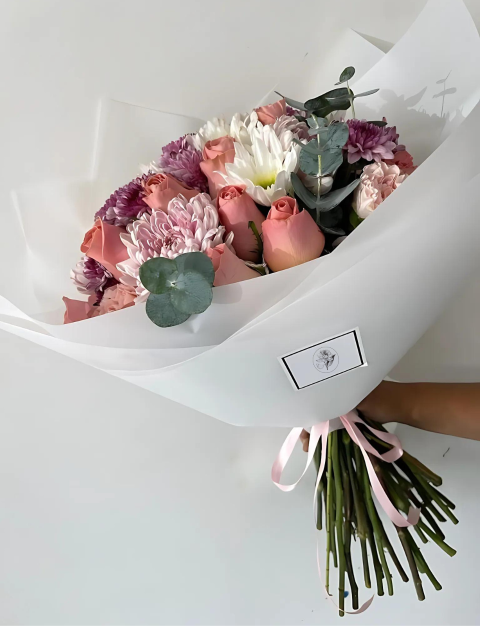 Todo el arreglo está envuelto en papel blanco, lo que le da una presentación limpia, moderna y elegante, perfecta para resaltar los colores y formas de las flores. Es ideal para cualquier ocasión especial en la que se quiera transmitir sentimientos de aprecio, amor o gratitud con un toque de frescura y estilo.