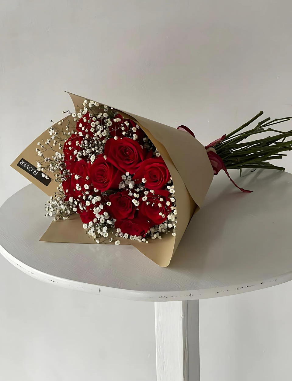 Este elegante arreglo combina la intensidad de 12 rosas rojas, símbolo de amor y pasión, con la delicadeza de ramitas de baby breath (gypsophila). La suavidad de las pequeñas flores blancas rodea y resalta el vibrante color de las rosas, creando un contraste perfecto. Ideal para expresar sentimientos profundos y románticos con un toque de sutileza y sofisticación. Perfecto para ocasiones especiales o como un gesto de amor eterno.