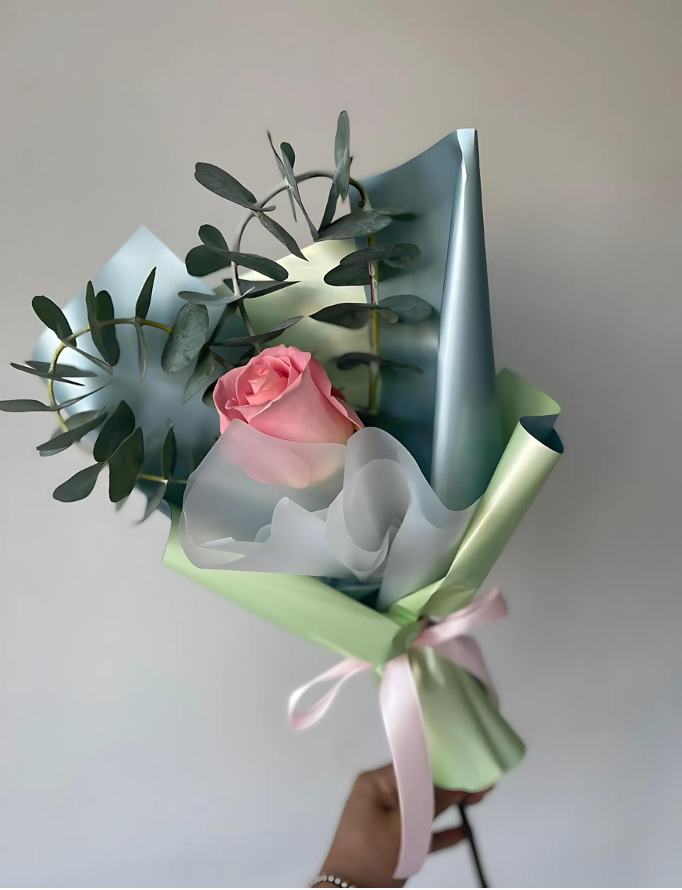 Este ramo sencillo pero elegante combina una rosa individual con una delicada rama de dólar (eucalipto dólar), creando un arreglo minimalista pero lleno de significado. La rosa, símbolo universal de amor, aprecio y belleza, es la protagonista del ramo, destacando por su elegancia y presencia. Su forma perfecta y sus pétalos suaves transmiten un mensaje directo y sincero, ya sea de amor, gratitud o admiración.